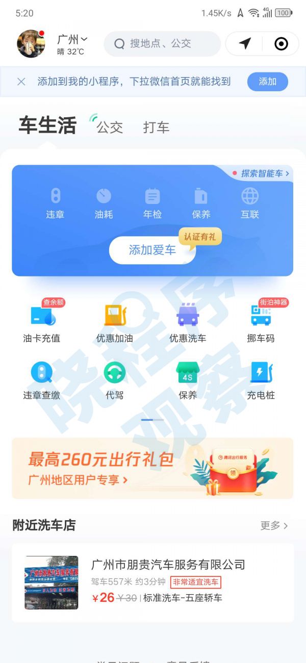 「出行服务」一共分为三个重要的模块:“车生活”、“公交”和“打车”,对比「滴滴出行」就能够发现,「滴滴出行」的重点更聚焦在出行,拥有打车、拼车、顺风车等不同的出行方式,而「出行服务」则更注重车主服务,从加油到洗车、保养,违章查缴等一条龙服务。