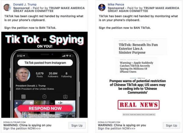 2020 年 7 月 17 日,特朗普竞选委员会在 Facebook 和 Instagram 投放了 18 个号召封禁 TikTok(抖音海外版)的新广告,分别以美国总统唐纳德·特朗普和副总统迈克·彭斯的名义发布。每条广告都用了同一句话,配以不同的图片和视频。