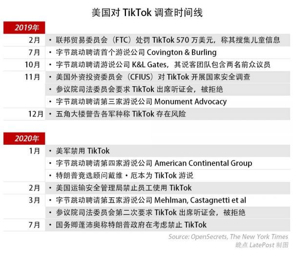 过去一年多,TikTok 两度被美国政府调查。第一次是 2019 年 2 月,美国公平贸易委员会(FTC)罚 TikTok 570 万美元,指责其未经家长允许获得儿童个人信息。第二次由美国外资投资委员会(CFIUS)在同年 10 月发起,调查 TikTok 持有大量用户数据,是否可能威胁美国国家安全。