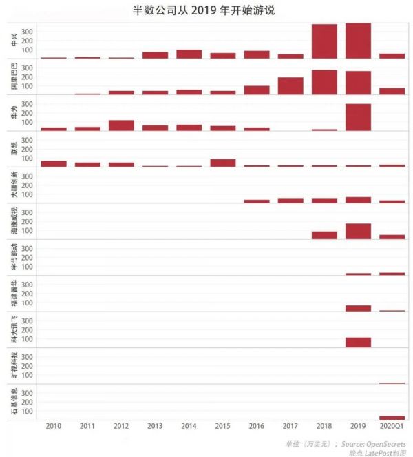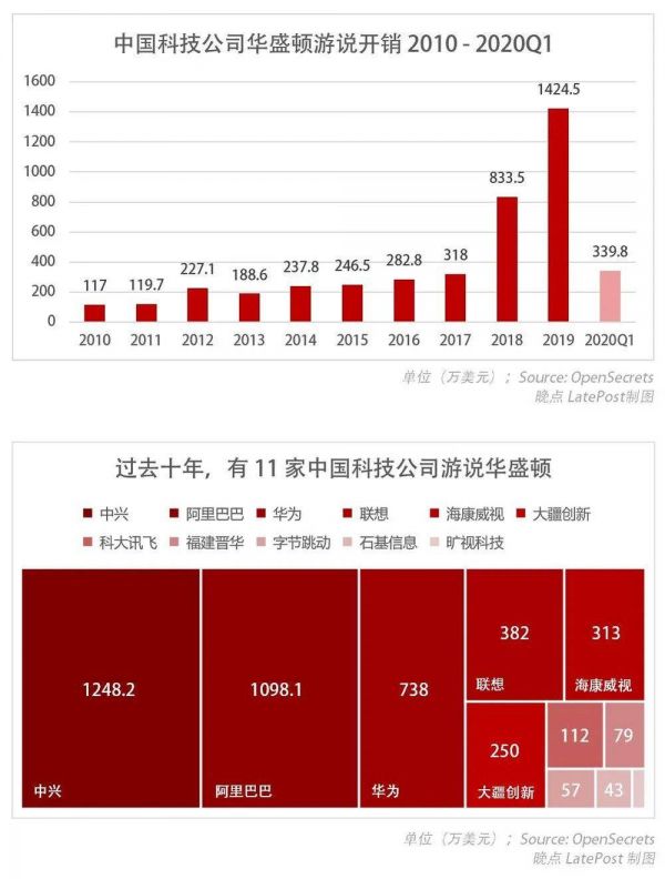 中国科技公司是这个行业里为数不多的快速增长的群体。随着中美关系急转直下,中国科技公司 2018 年和 2019 年在美游说投入分别比上一年增长 162% 和 71%。2020 年一季度,中国科技公司游说投入超过 2017 年全年。