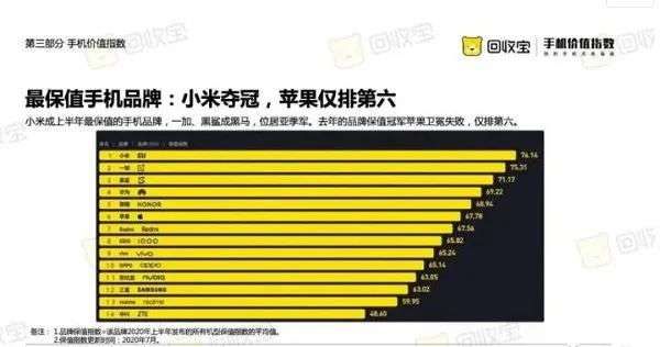 事实上,苹果拉低iPhone产品的身段或许正是它自己的选择。就在日前回收宝方面发布的“2020年上半年手机价值指数”白皮书中显示,iPhone已经从神坛跌落,在最保值品牌中仅排行第六。这一切的原因,固然有新款iPhone SE在上市后就被国内电商平台将价格打了个8折,使得上市就遭遇价格跳水的情况,但这自然也让外界对iPhone的保值率有了一定的担忧。