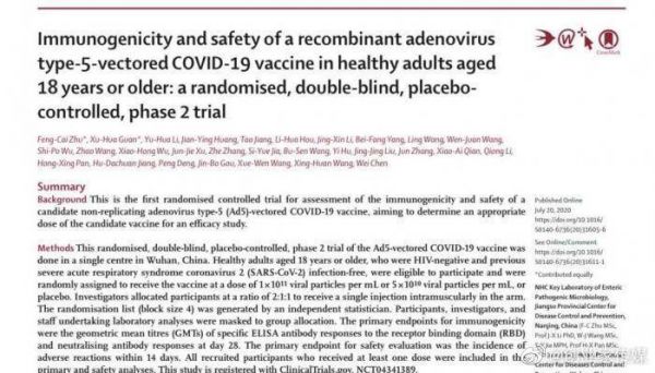 根据《柳叶刀》上发表的最新研究论文,在中国进行的前述新冠候选疫苗二期临床试验发现,该疫苗是安全的,并且可以诱发免疫反应。