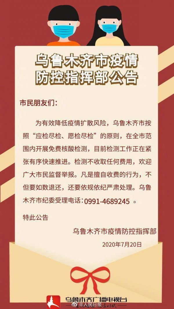 @央视新闻【乌鲁木齐全民免费核酸检测】乌鲁木齐市防疫指挥部发布消息,为有效降低疫情扩散风险,乌鲁木齐市按照“应检尽检、愿检尽检”的原则,在全市范围内开展免费核酸检测,目前检测工作正在紧张有序快速推进。检测不收取任何费用,欢迎广大市民监督举报。凡是擅自收费的行为,不但要如数退还,还要依规依纪严肃处理。乌鲁木齐市纪委受理电话:0991-4689245。