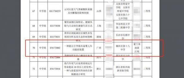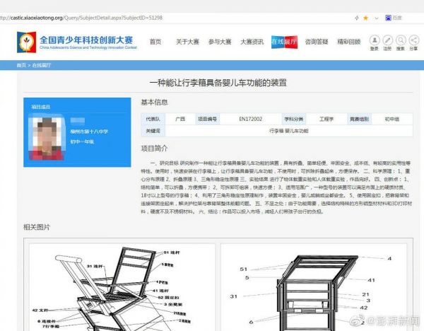 @澎湃新闻【青创赛一奖项被指抄袭辅导老师专利,老师:两者均由学生发明】继第33届、34届全国青少年科技创新大赛多项获奖作品被质疑造假后,第32届大赛一获二等奖项目也遭到质疑,被指与项目辅导老师专利发明名称、内容重合。遭质疑的项目名为《一种能让行李箱具备婴儿车功能的装置》,项目成员为柳州市第十八中学初中一年级学生李某烨。前述获奖项目辅导老师之一、专利项目发明人蒙兰荣称,前述参赛项目及被质疑雷同的专利发明均由辅导老师指导李某烨完成,不存在抄袭情况。其解释,前述项目由学校出资申请,且因李某烨已毕业,为了专利发明后续工作能顺利进行,专利项目发明人未填入学生李某烨的名字。