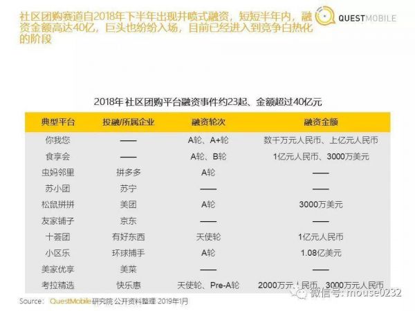 2016年,“拼团”概念兴起,也带来了社区团购雏形。2018年资本开始涌入,掀起了“百团大战”:你我您、食享会、十荟团、松鼠拼拼、考拉精选等头部项目获得千万到亿元级别的融资,入局的资方更是包括红杉资本、IDG资本、真格基金等重量玩家。