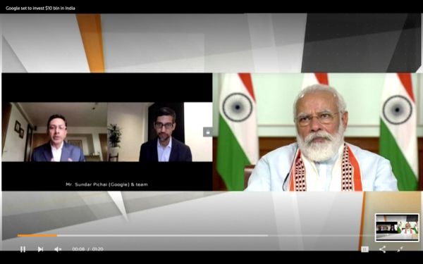 谷歌CEO桑达尔·皮查伊(Sundar Pichai)与印度总理纳伦德拉·莫迪(Narendra Modi)在7月13日就谷歌的100亿美元投资进行了视频会议。莫迪形容这次谈话“非常有意义”,双方讨论了在新冠疫情下创造工作机会以及网络安保等议题。