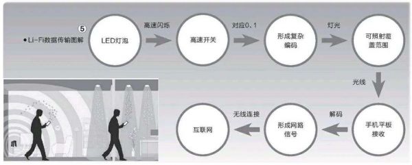 通俗讲,和无线电波一样,光波也是电磁波,因此在普通的LED 灯泡上加装一个微芯片后,可以控制灯泡以每秒数百万次的频率闪烁,亮了表示1,灭了代表0,二进制的数据就被快速编码成灯光信号,人的肉眼并无法识别到这种高频变化。