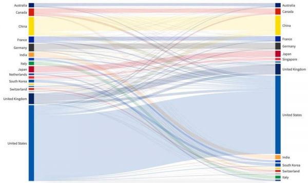 根据各个国家 AI 人才的流入与流出,我们绘制了下图: