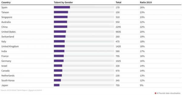 2019 全球 AI 人才报告展示了在人工智能领域有影响力学术论文作者,以及自报告 AI 专家的数量。他们的数量在过去的几年里有了显著的增长。在 AI 领域里,女性的影响力仍然不足,但一些国家相比其他国家更加接近于平等。