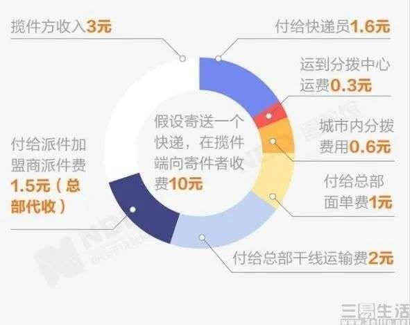 在这一报道中还曾举例称,假设用户付出10元快递费,那么其中的3元归揽件方,1.6元归快递员,快递公司总部真正收到的只有三项费用,即为面单费1元、干线运输费2元,以及付给派件加盟商派件费1.5元(总部代收)。