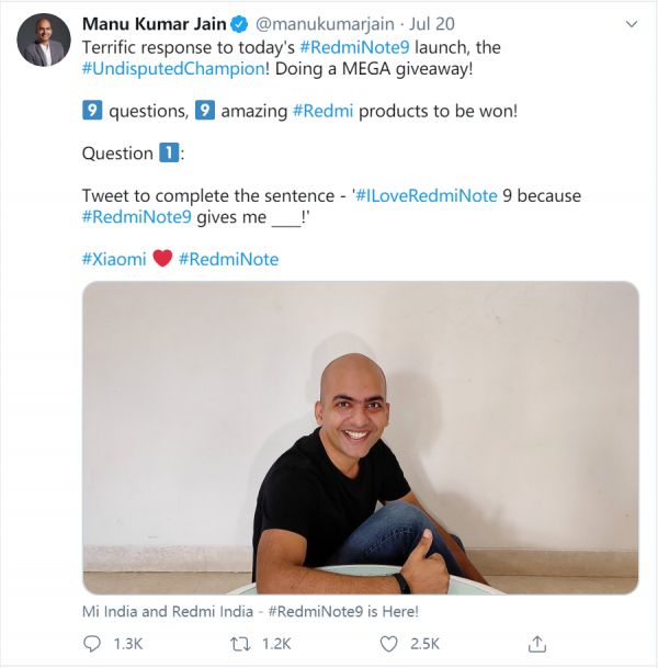 小米印度市场主管Manu Kumar Jain的推特也开始重新“营业”。在7月20日红米Note 9新品发布当天,Manu连发几十条宣传推特。