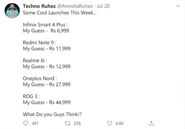 7月20日,数码博主@Techno Ruhez在推特上预测将在本周内发布的多款品牌新产品价格,获得4800个赞,吸引了很多用户在评论中推断价格。