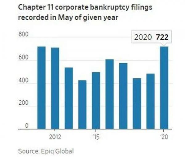 美国破产法庭的数据显示,5月份,全美共计有722家企业申请破产保护,同比猛增48%。环比来看也很惊人,增速达到28%。