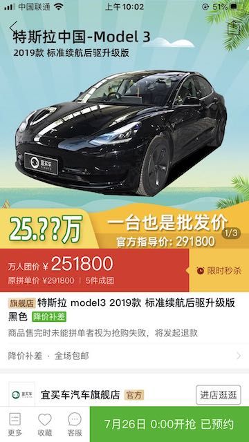 “一台补贴4万元!”近日,拼多多平台新上线了一款“特斯拉model3 2019款标准续航后驱升级版黑色”产品。据平台信息,该车官方指导价为29.18万元,而拼多多上的拼团价格仅为25.18万元,5件即可成团,该产品将在7月26日零点开抢。