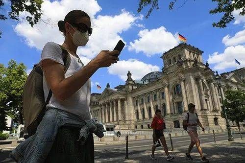 2020年6月16日,德国柏林,一名行人戴着口罩在议会大楼前使用智能手机。