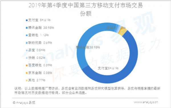 到了2019年底,易观的统计数据显示,支付宝与腾讯金融(财付通)的份额分别达54.61%和38.98%。