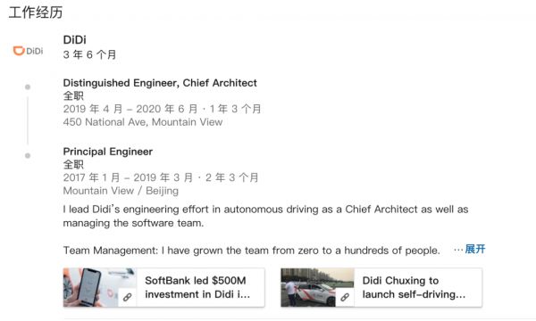贾兆寅的领英资料显示,他在滴滴的工作周期截止到2020年6月——相当于是确定了这一消息,不过他的领英资料上还并未增加出Cruise的工作经历。