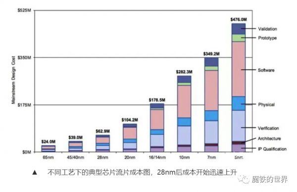 由于芯片的设计、制造成本和工艺制程之间不仅仅是水涨船高的关系,而是呈现加速飙涨的趋势。一款芯片仅从设计到流片,28nm芯片就需要6290万美元,5nm芯片则需要4.76亿美元,工艺制程推进5代,成本却增加了大约6.6倍。