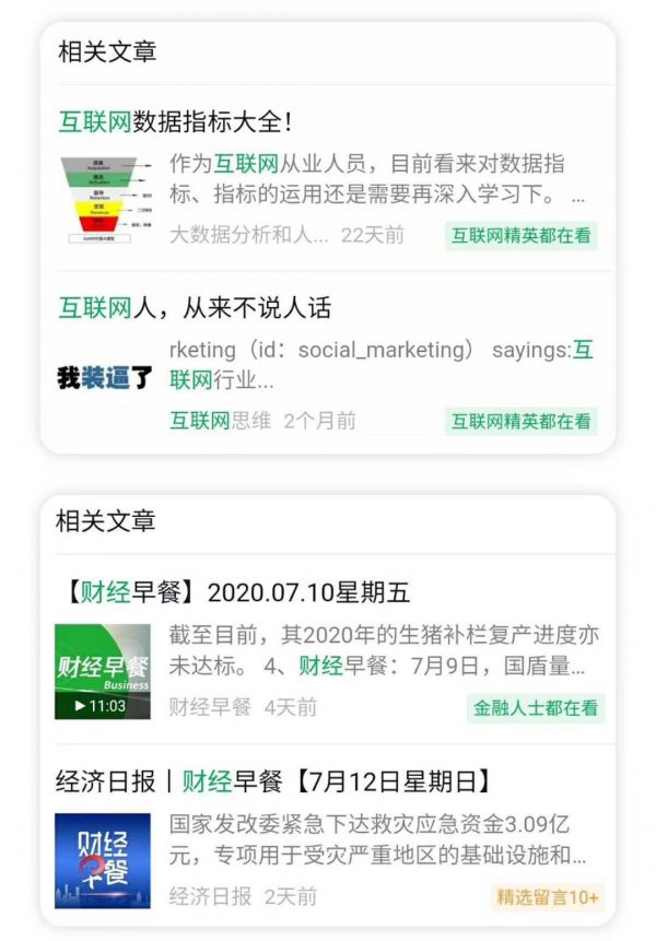 另一个公众号文章的大流量入口,就是搜一搜。近期搜一搜页面也有升级,部分文章被加上了“用户标签”。例如“互联网精英们都在看”、“金融人士都在看”、“体育达人都在看”等等。