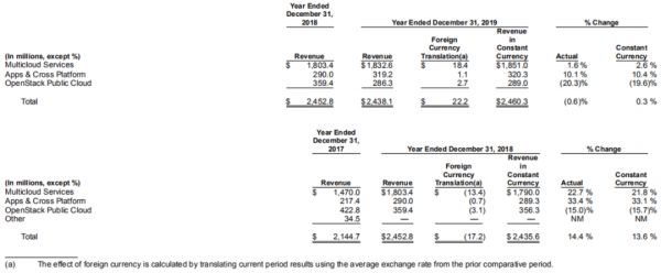 2019年11月,公司又以现金对价3.16亿美元收购了Onica,后者是AWS顾问和托管服务提供商,服务包括战略咨询、架构和应用程序开发等。交易中约6,200万美元已初步分配给可摊销无形资产。收购后的一个半月,Onica已整合至混合云服务部门中,并在2019年为Rackspace贡献了2100万美元收入。