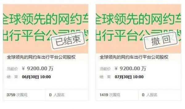 近日,阿里拍卖上线"全球领先的网约车出行平台公司"部分股权,并将于7月29日进行网络拍卖,起拍价9200万元。不过,拍卖随即被撤回。而在此前,阿里也曾上线相同拍品,后因竞价失败拍卖结束。相关信息显示,标的公司是滴滴。