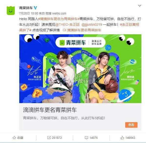 近期,滴滴拼车还更名为青菜拼车,采用全新品牌标识,并邀请人气偶像朱正廷、黄明昊担任新品牌大使,以5折的"白菜价"开始大规模抢占二、三、四线城市网约车市场。