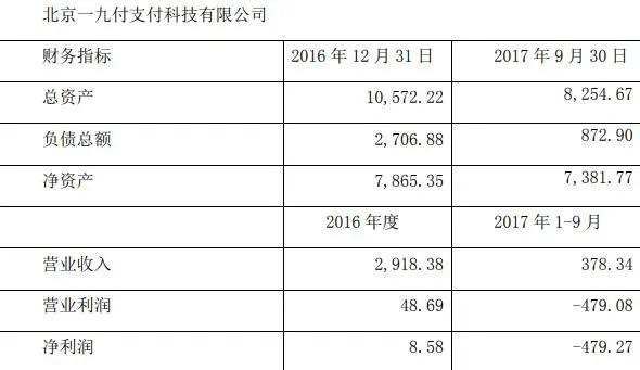 财报显示,2016年一九付营收2918.38万元,净利润8.58万元;2017年前三季度一九付营收378.34万元,净利润-479.27万元。截至2017年9月30日,公司总资产8254.67万元,收益法的评估值为1.80亿元。