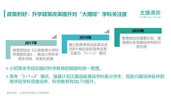 2019年高考改革出台了“3+1+2”方案,2020年教育部印发的强基计划提出着重选拔基础学科拔尖的学生。国家颁布的一系列政策将极大提高学生对“大理综”学科的关注度,且升学选拔的政策体现出对在重点科学学科有足够特长的学生的青睐,这点与教育公平本身并不冲突,而是国家意图通过调整高考政策,进而影响未来10-20年的人才培养结构和水平。
