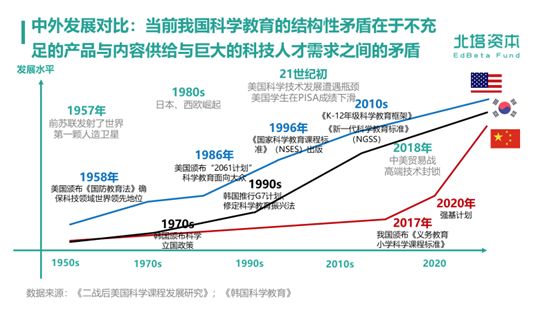 回顾上世纪的美国和韩国的科学教育政策可以看出,科学教育政策的演进往往伴随着国家间技术竞争格局的变动。美国科学教育政策起始于美苏争霸的冷战格局,80年代日德制造业的崛起威胁到美国,美国再次进行科学教育改革。2010年美国颁布的NGSS(《新一代科学教育标准》)将科学教育的重要性和完善度进一步提升,意图确保美国的科技水平继续领跑全球。