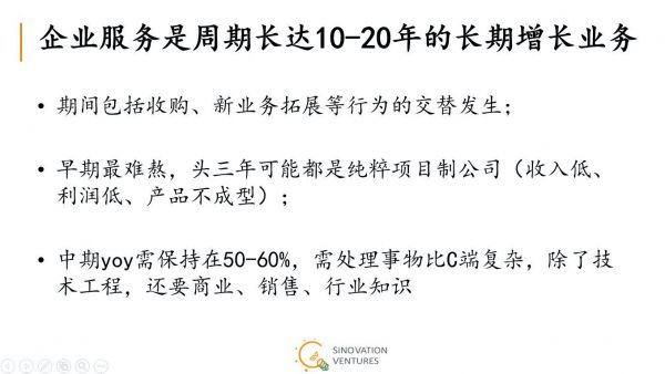 对企业服务创业者来说,可能不会像过去10年那么惊心动魄、有成就感,也不像做c端产品能获得10倍以上的爆发式增长。但是产品一旦成型,10年、20年这个行业也不会抛弃你,可以持续不断的稳健增长,无论是客户规模还是业务类型。