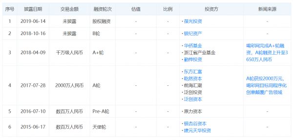 喝彩网成立于2015年,在数字广告、程序化创意、海报、邀请函等诸多板块与媒体及广告公司达成广泛合作。经过技术的不断迭代和设计素材的积累,喝彩网于2017年进入中国程序化广告技术生态图,逐步成长为人工智能平面设计平台。根据天眼查信息,喝彩网曾于2017年完成千万元级别A轮和A+轮融资,于2018年完成B轮融资,并于2019年6月获得葆光投资的股权投资。