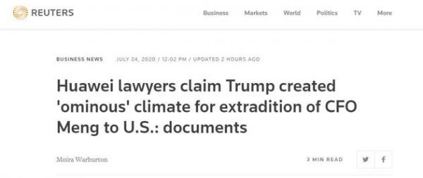 【环球网报道】据路透社7月24日报道,华为公司首席财务官孟晚舟的律师已向加拿大法院申请中止执行美国引渡程序。