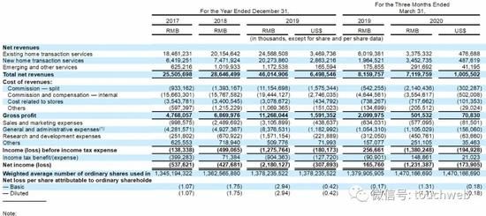 贝壳找房2017年、2018年、2019年净亏损分别为5.38亿元、4.27亿元、21.8亿元(约3.07亿美元);贝壳找房2020年第一季度净亏损为12.31亿元。
