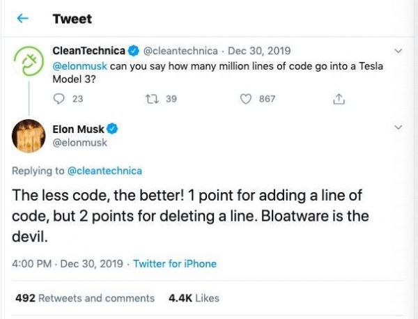 对于特斯拉到底有多少行代码,马斯克是这样回复大家的:“代码行数当然是越少越好,写一行加一分,但删一行得算二分!”