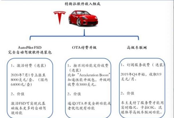 特斯拉在汽车行业首次引入了软件应用商店的概念,方便用户购买软件升级。车主可以在特斯拉 App 中购买辅助驾驶功能、完全自动驾驶功能、加速性能提升以及其他高端功能。同时特斯拉首度开启高级连接服务收费,只有车主支付了服务费才能使用实时路况、卡拉 OK、流媒体等功能。