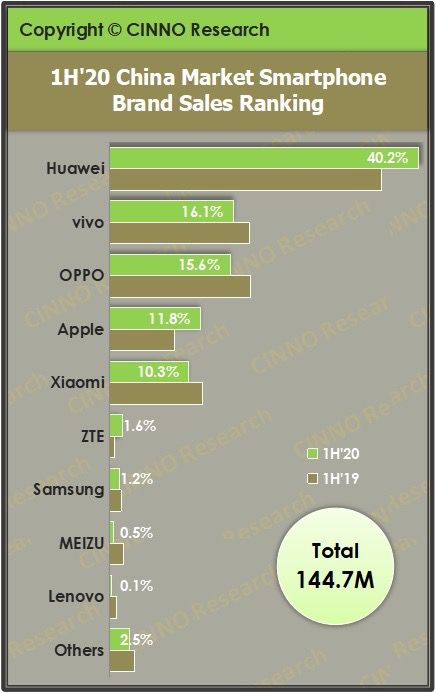 CINNO Research 数据显示,上半年,华为(含荣耀)、vivo(含 iQOO)、OPPO(含 realme),三家出货总量占国内智能手机市场 71.9%,前五名只有华为和苹果市场份额增加,vivo、OPPO以及小米市场份额都是减少的。