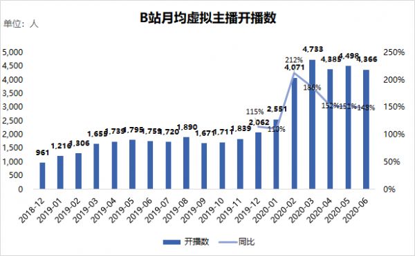 现阶段,全球虚拟UP主(虚拟主播)的数量仍在快速增长。日本userlocal网站的数据显示,截至2020年1月, YouTube上的虚拟UP主已经超过了1万名。国内的话,B站目前是虚拟UP主们活跃的最主要平台。小葫芦的监测数据显示,2020年初至今,B站上每个月约有4000多个虚拟主播开播,过去半年的月均增速都在100%以上。