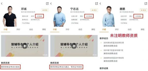 关于猿辅导讲师的学历水平和讲课水准,也存在一定争议。猿辅导官方曾声称平台讲师均来自国内前20%的知名高校,在被曝光存在讲师学历和宣传不符这一情况后,猿辅导便低调了许多。如今,猿辅导官网上关于师资的介绍仅有“1%录取率聘用一线资深师资”这一句模棱两可的话。