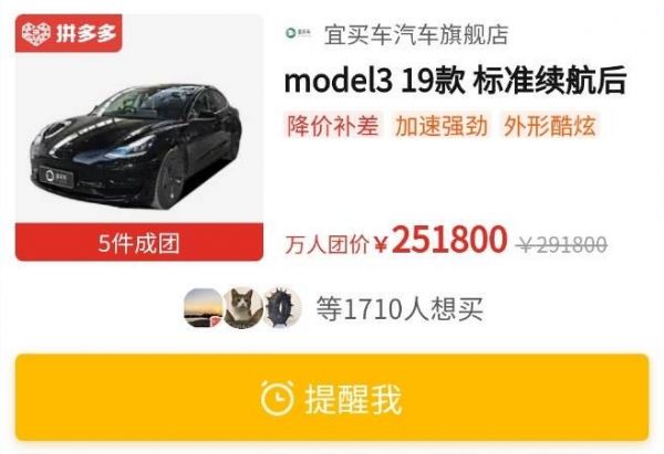 随着拼多多的横空出世,“万物皆可拼”的团购模式逐渐成为主流。最近,网红车型特斯拉Model 3也不幸“躺枪”,从网上传出的图片来看,一家名为“宜买车”的拼多多商家在平台发起国产Model 3标准续航后驱升级版车型拼团,售价更是低至25.18万。