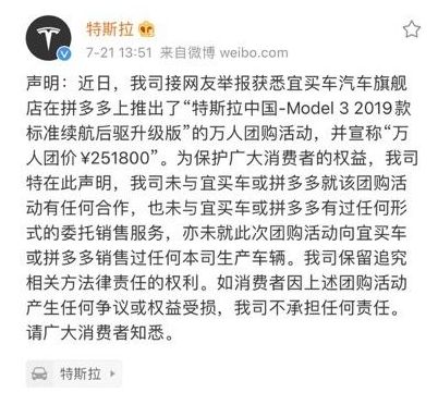 随后,特斯拉官方出来“打假”:没有与拼多多有任何合作,后续出现问题也不承担相关责任。