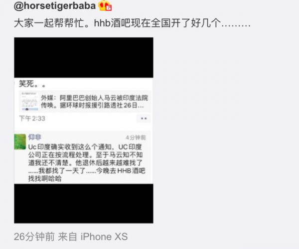 @新浪科技【阿里王帅回应“马云被印度法院传唤”一事:UC印度正在按流程处理】阿里巴巴合伙人王帅在朋友圈回应称,UC印度确实收到通知,UC印度公司正在按流程处理。针对案件对于马云的传唤,王帅表示,“马云知不知道我还不清楚。他退休后越来越难找了,我都找了一天了,今晚去HHB酒吧找找啊。”