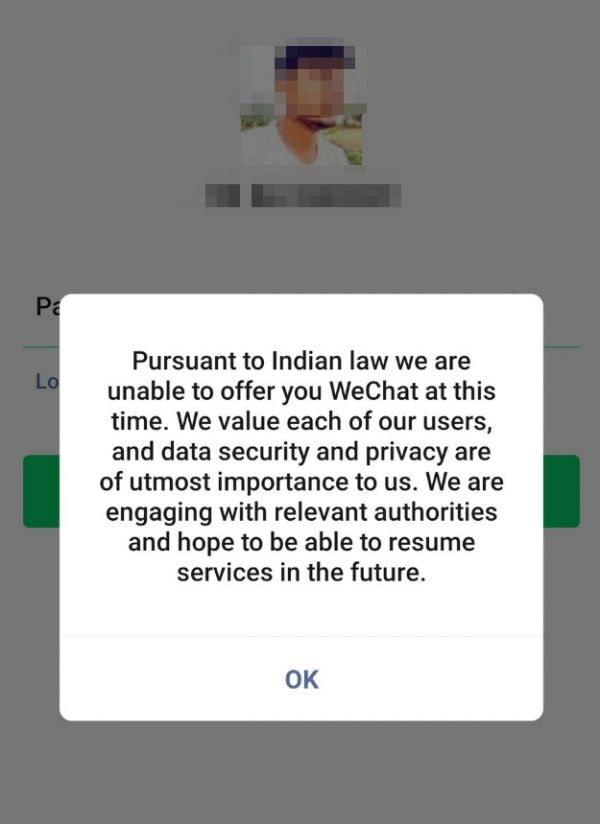 在账号被登出时,用户收到一条来自微信团队的信息,写道:“根据印度法律,我们目前不能为您提供微信服务。我们重视每一位用户,数据安全和隐私对我们来说是最重要的。我们正在与相关部门接触,希望能够在未来恢复服务。”