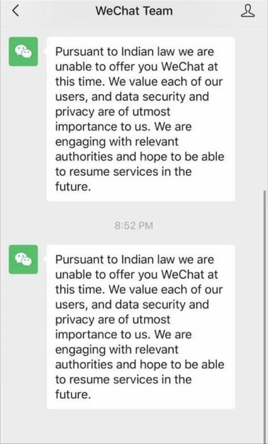 “根据印度法律,我们现在不能为您提供微信服务。我们重视每一个用户,数据安全和隐私对我们来说是最重要的。我们正在与相关部门交涉,希望能够在未来恢复服务。”