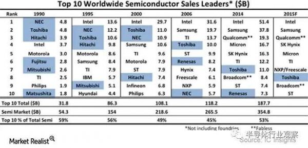 然而到2000年日本仅剩三家,2014年只有两家公司。由于日本对新兴趋势的适应缓慢例如移动半导体,再加上无晶圆厂的飞速发展,使得日本企业逐渐淡出前十榜单。