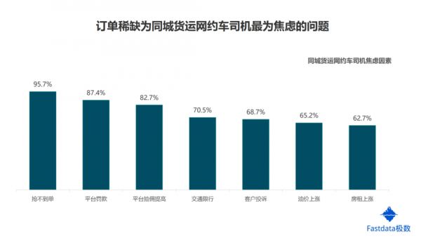 然而,这样的时间并没有维持多久。因为货运司机的不断涌入,在商家需求固定的情况下,平台订单又成了制约货运网约车发展的另一个问题。据Fastdata在2019年上半年的统计数据显示,订单稀缺成为同城货运网约车司机最为焦虑的问题。