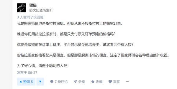 以知乎话题“用货拉拉搬家怎么样?”下方的问答为例,共计48个回答当中有17个差评,5个好评,可以看到,如果选择货拉拉,则大概率会获得不好的服务体验。而在这些差评中,用户最集中反馈的便是司机坐地起价、乱收费、平台监管不力等问题。