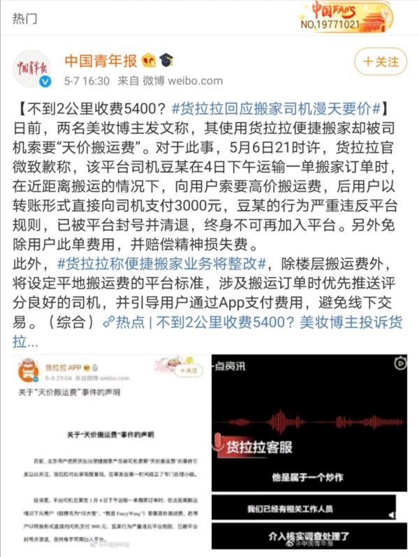 例如在今年5月5日,就有网友爆料,在北京预约货拉拉搬家,不到2公里的距离收费5400元。而当事件曝光,记者对平台进行采访时,货拉拉却回应此事是用户的炒作行为。