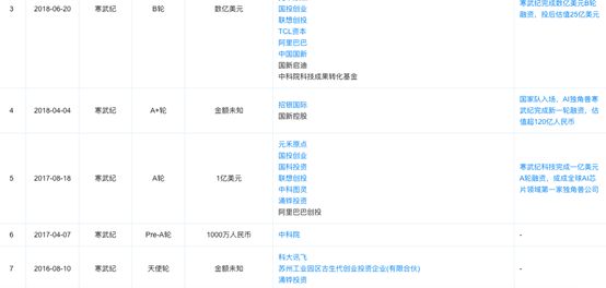 据企查查数据显示,寒武纪在2016年获得了科大讯飞、涌铧投资的天使轮融资,在2017年先是获得了中科院的1000万人民币的融资,后又获得了元禾原点等1亿美元的A轮融资,2018年获得了数亿美元的B轮融资。