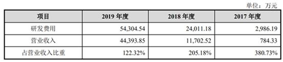 2017年、2018年和2019年,寒武纪的研发费用分别为0.29亿、2.4亿和5.4亿,研发费用率分别为380.73%、205.18%和122.32%。