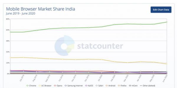 另据调研公司StatCounter数据,截至2020年6月,UC浏览器在印度的市场份额为14.46%,远低于谷歌Chrome浏览器的75.56%。